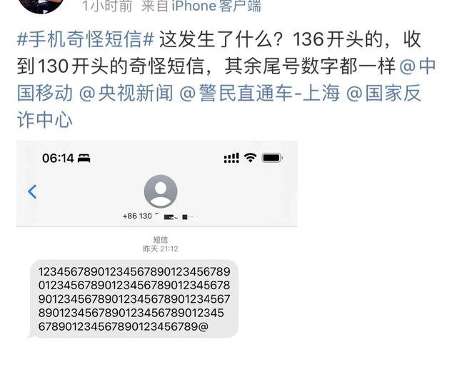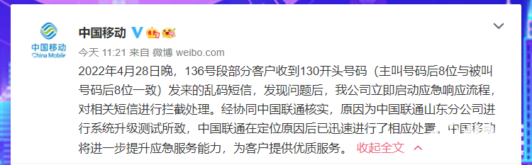 回应原文:2022年4月28日晚,136号段部分客户收到130开头号码(主叫号码后8位与被叫号码后8位一致)发来的乱码短信,发现问题后,我公司立即启动应急响应流程,对相关短信进行拦截处理。经协同中国联通核实,原因为中国联通山东分公司进行系统升级测试所致,中国联通在定位原因后已迅速进行了相应处置。中国移动将进一步提升应急服务能力,为客户提供优质服务。