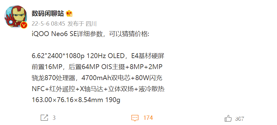 此前,iQOO官方在微博发布消息称,Neo家族的新成员iQOO Neo6 SE将于2022年5月6日发布。从iQOO微博的后缀来看,iQOO Neo6 SE或将主打“竞速标杆”。