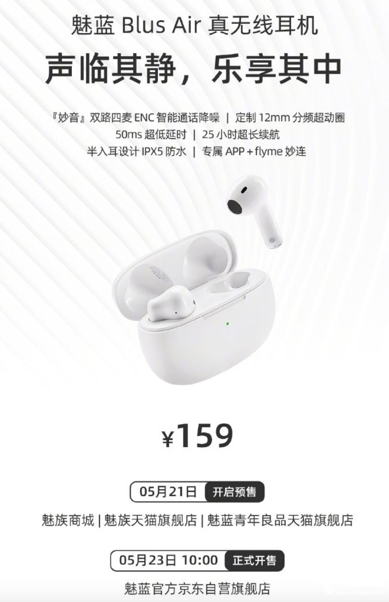 日前消息,魅蓝Blus Air真无线耳机正式发布,售价159元,将于5月21号在魅族商城、魅族天猫旗舰店、魅蓝青年良品天猫旗舰店开启预售。