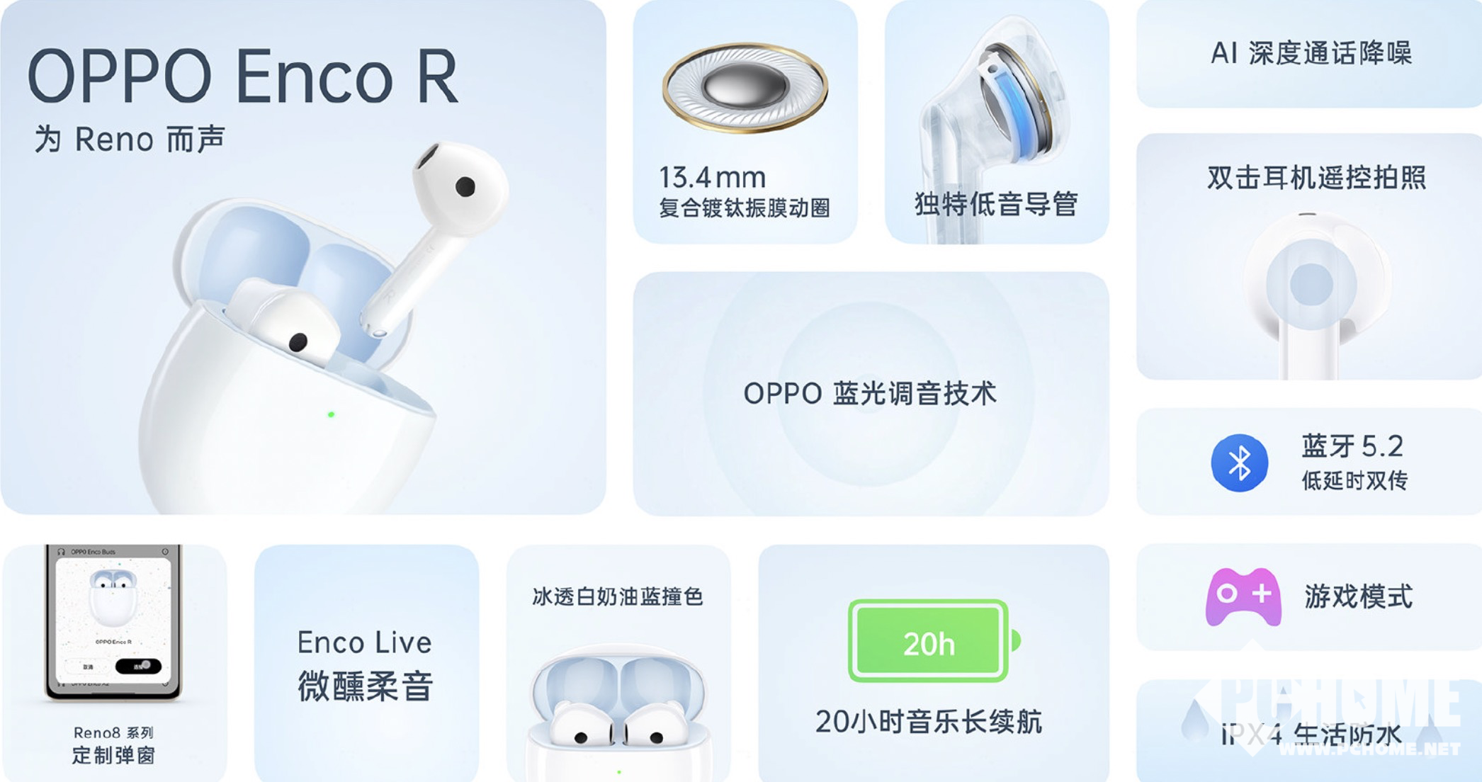 除了OPPO Reno8系列手机之外,全新的OPPO Enco R耳机也正式到来,拥有百搭的配色、定制弹窗、Enco Live微醺柔音、20小时长续航、AI深度通话降噪等配置,OPPO Enco R是一款适应全场景的真无线耳机。