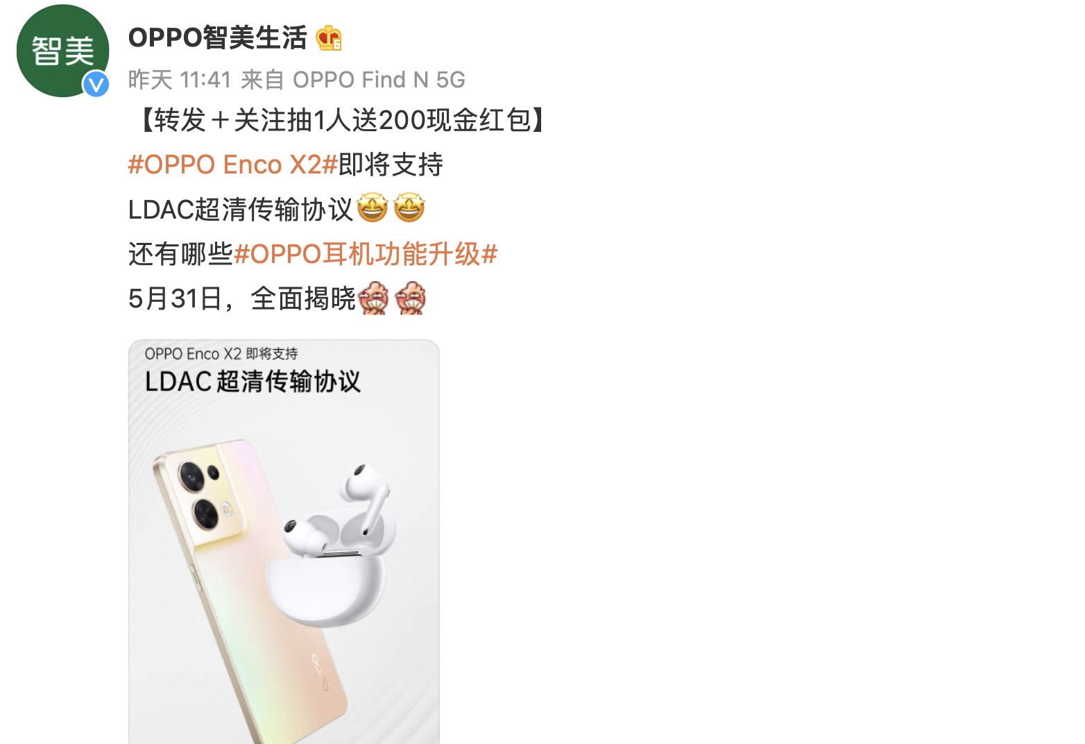 前些日,OPPO智美生活表示OPPO Enco耳机将有新升级,OPPO表示“这次要来点不一样的”,官方微博文案中是“想让更多人一起好好听”。OPPO智美生活官方表示OPPO耳机的新功能将在5月31好全面揭晓,除了非OPPO安卓手机弹窗外,OPPO Enco X2即将支持LDAC超清传输协议,为用户带来更加清晰悦耳无损的音质。除了这两项已经公布的功能之外,OPPO耳机应该还会有其他的新功能,让我们共同期待。