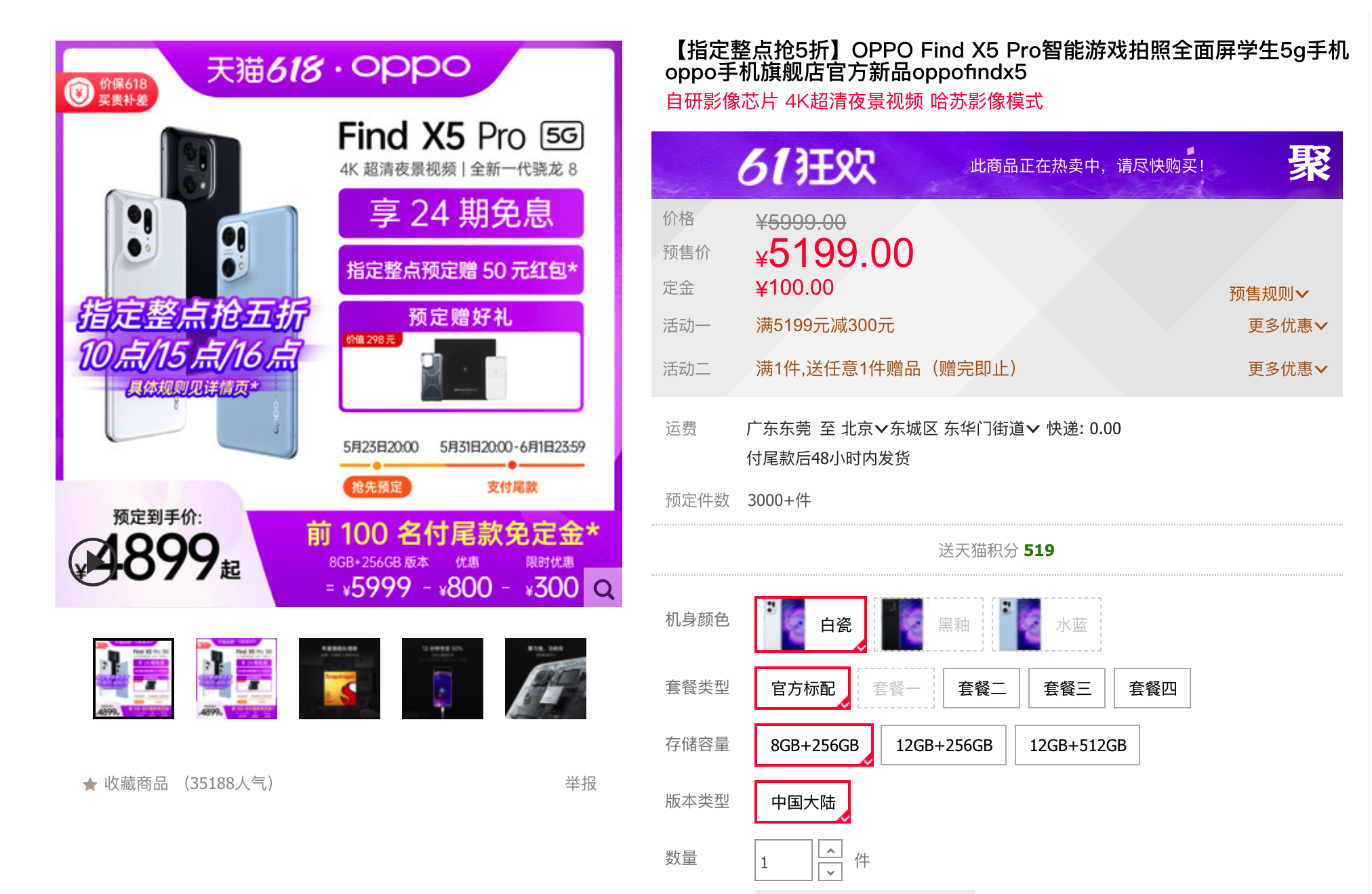 现在在天猫OPPO官方旗舰店,OPPO Find X5可享24期分期免息,优惠400元+限时优惠300元,最高立减700元,8GB+256GB最低到手3699元;Find X5 Pro可享24期分期免息,优惠800元+限时优惠300元,最高立减1100元,8GB+256GB最低到手4899元。