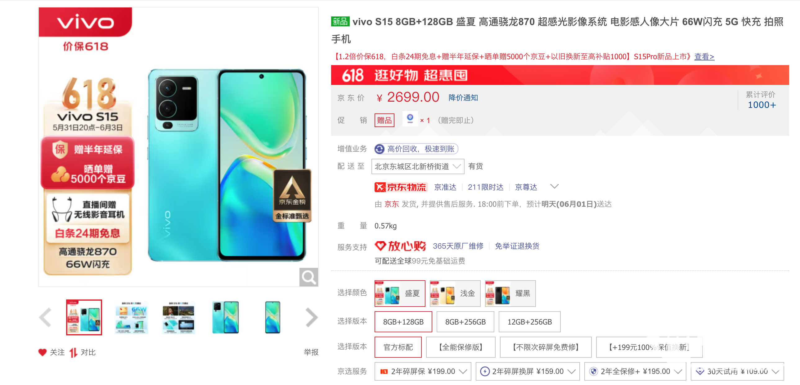 5月31日-6月3日,vivo S15系列可享白条24期免息+赠半年延保+晒单赠5000个京豆+以旧换新至高补贴1000等活动。