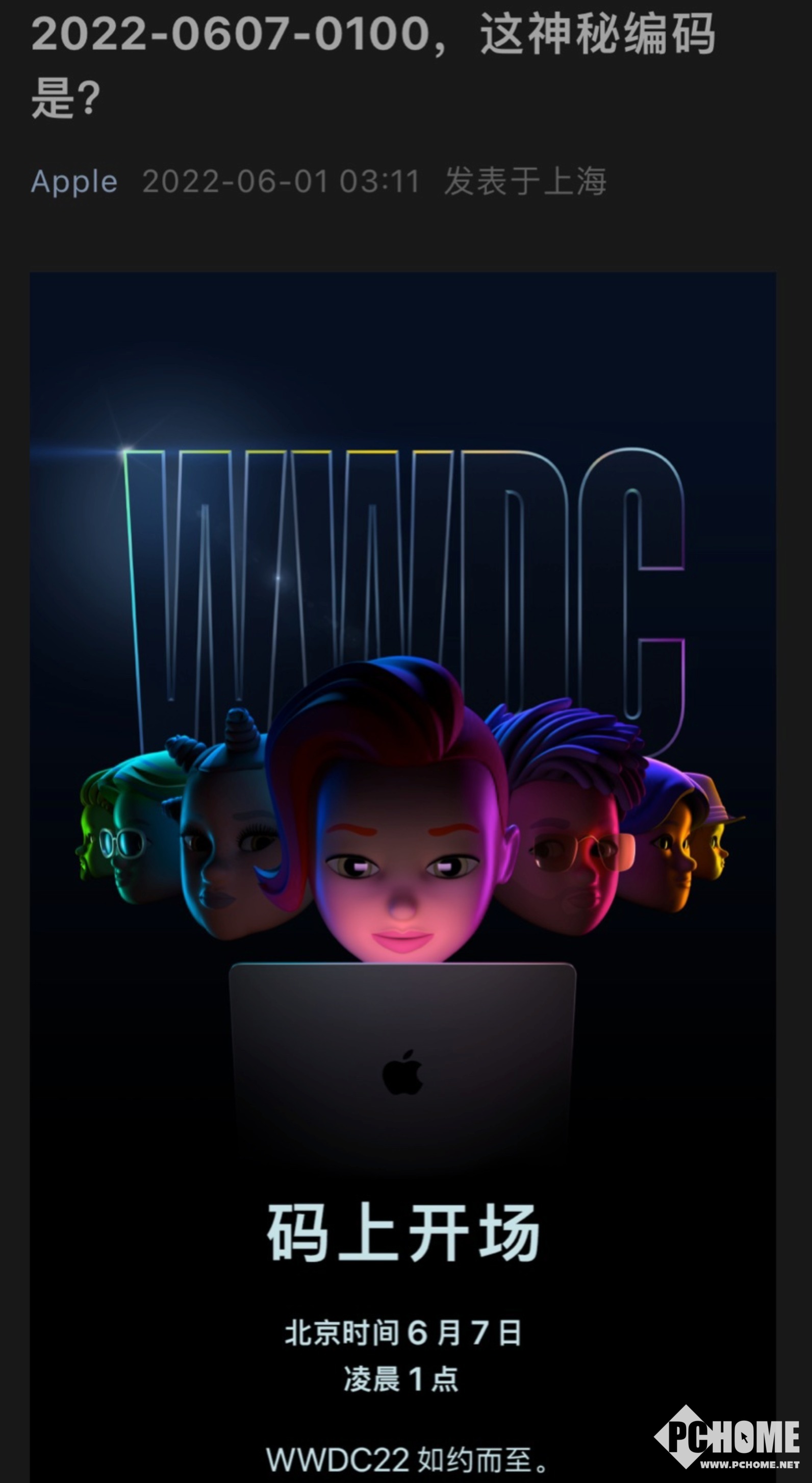 Apple官方微信公众号发布了一串什么代码——“2022-0607-0100,这神秘编码是?”该神秘代码的意思是北京时间6月7日凌晨1点,WWDC22如约而至。