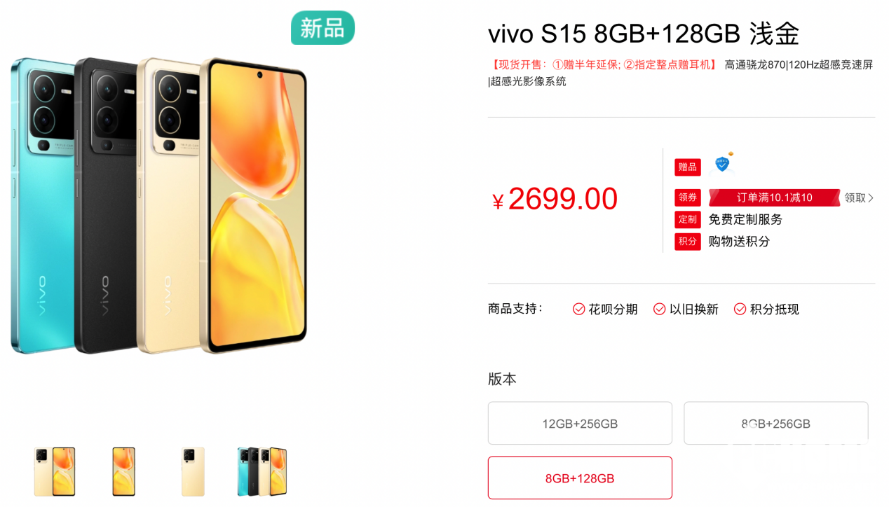 目前,vivo S15系列持续热销中,618活动期间还有全渠道全程价保服务(5月28日至6月20日)、以旧换新、分期免息等优惠福利。vivo S15 8GB+128GB版本,2699元;8GB+256GB版本,2999元;12GB+256GB版本,3299元。vivo S15 Pro 8GB+256GB版本,3399元;12GB+256GB版本,3699元。以上版本均可在vivo官网、官方体验店、京东、天猫、苏宁以及线下各类合作门店购买。