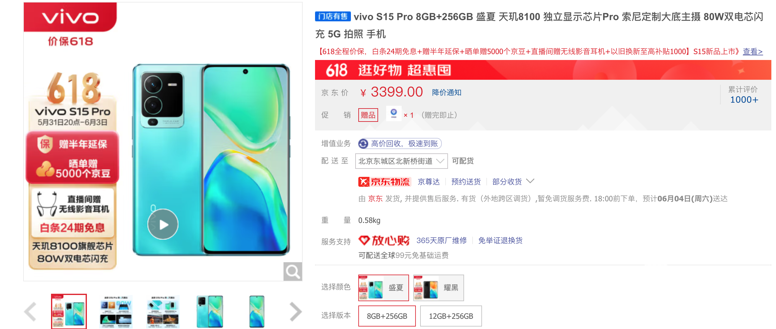 细节方面,vivo S15 Pro可享受618全程价保,白条24期免息+赠半年延保+晒单赠5000个京豆+直播间赠无线影音耳机+以旧换新至高补贴1000等促销活动,8GB+256GB版售价仅为3399元。