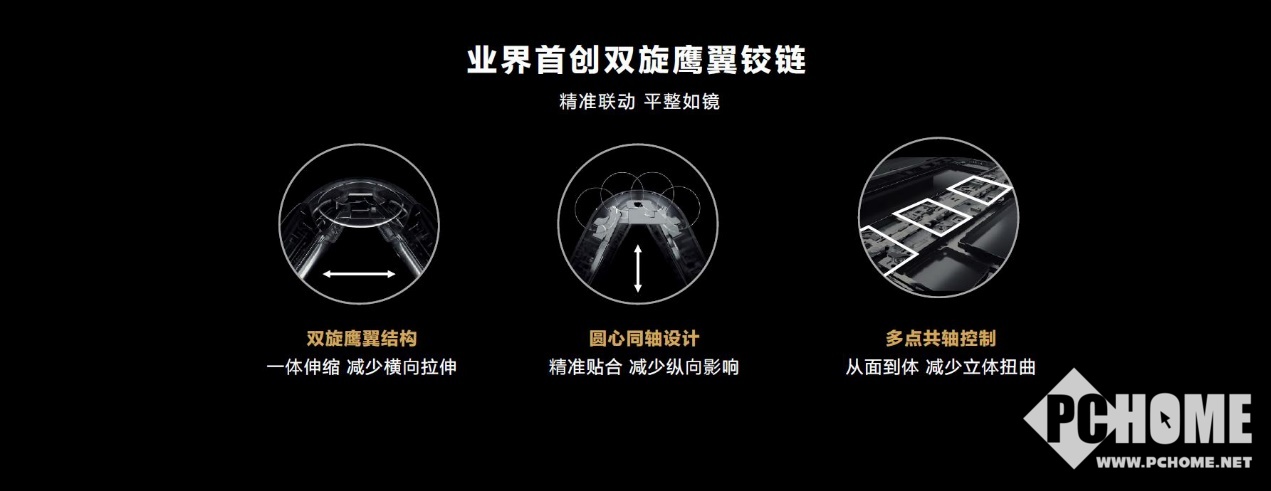 华为Mate Xs 2独创双旋鹰翼铰链,实现从屏幕到铰链的精准联动。双旋鹰翼结构,通过恒长控制,一体伸缩,减少对屏幕的横向拉伸;圆心同轴设计,精准贴合,减少纵向影响,实现铰链精准贴合屏幕;最后,通过多点共轴控制,降低段距带来的误差影响,减少立体扭曲,使得转轴和屏幕贴合更紧密。