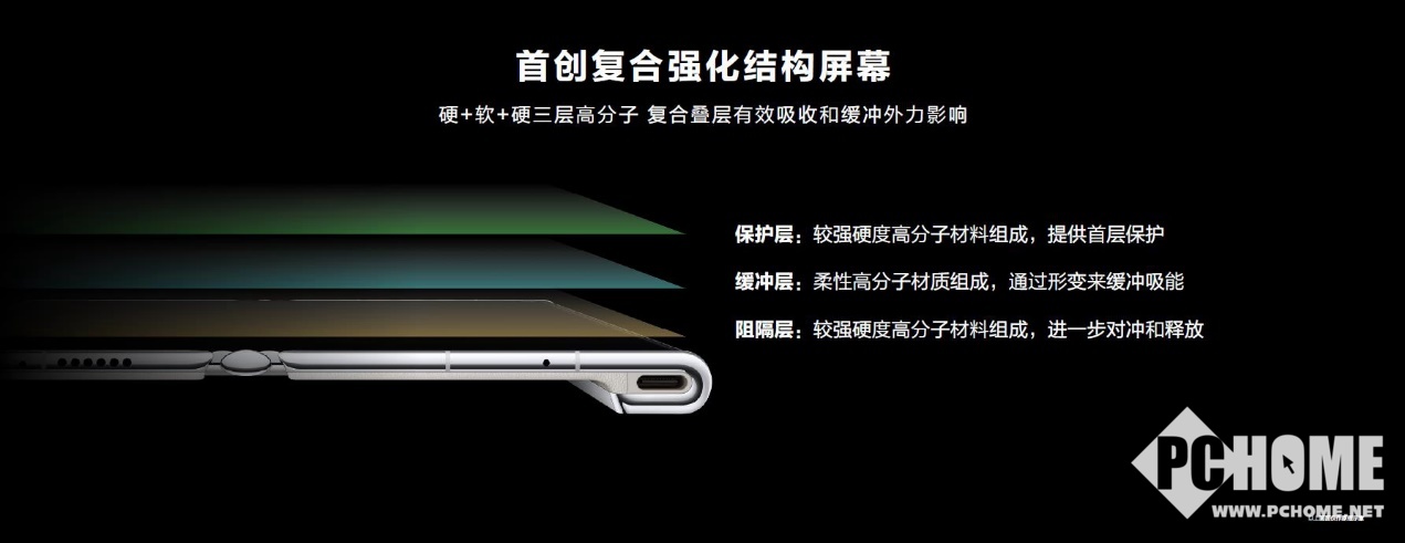 华为通过对屏幕的不同叠层方案进行微米级的精确仿真研究,采集千万量级可靠性大数据,精细化调优收敛最优方案,以找到不同材料的组合,最大化应对外力冲击,最终首创复合强化结构屏幕,使用“硬+软+硬”三层高分子复合叠层结构,形成“保护层+缓冲层+阻隔层”的三层结构,有效吸收和缓冲外力,更好地保护屏幕核心显示模组,从而确保屏幕的可靠耐用。