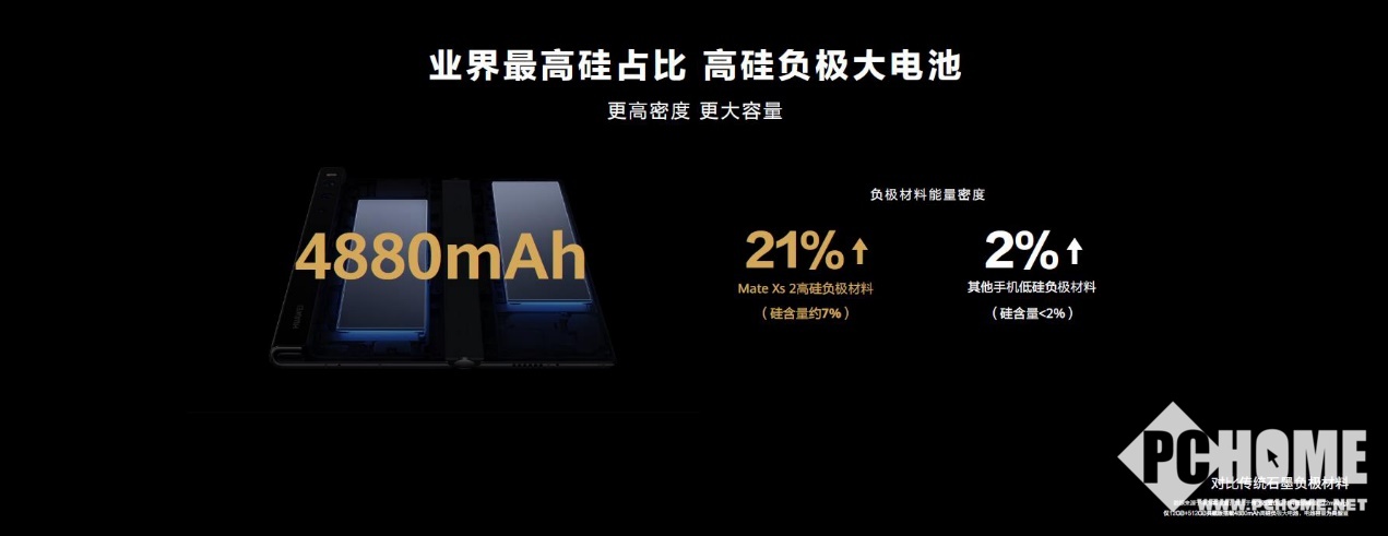 华为Mate Xs 2典藏版上使用了高硅负极电池,新电池通过碳包覆结构和创新柔性聚合物粘结剂来抑制膨胀和脱落;创新地使用锂箔补锂,将首次充放电效率提升26%;在硅负极电池里使用纳米碳管技术,将导电能力提升4倍,进一步提升硅负极电池的性能表现。