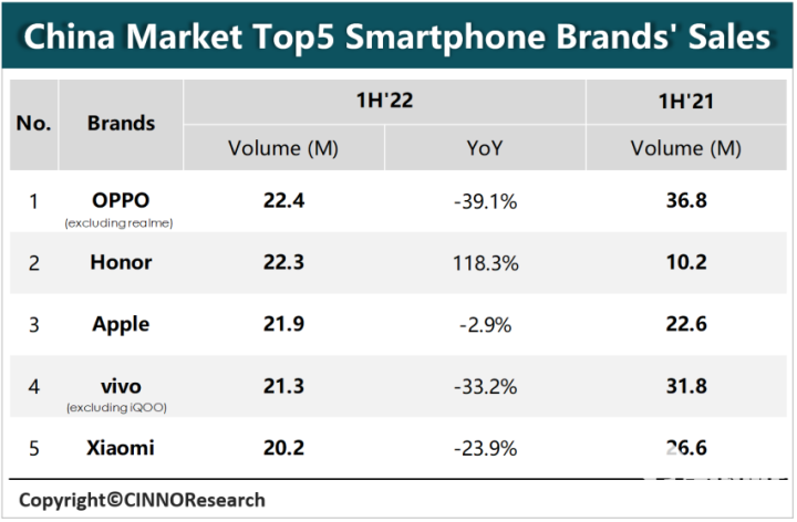 而随着6月份销量数据的出炉,2022年上半年的国内市场数据也就此揭晓。OPPO以2240万部的出货量占据第一(不包括realme的销量),荣耀/苹果/vivo/小米则分列2-5位。