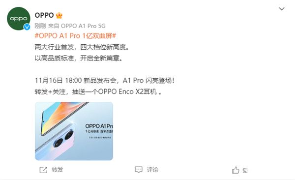 2022年11月14日,OPPO官方发布消息称,将于2022年11月16日召开新品发布会,发布全新的A系列新品——OPPO A1 Pro。