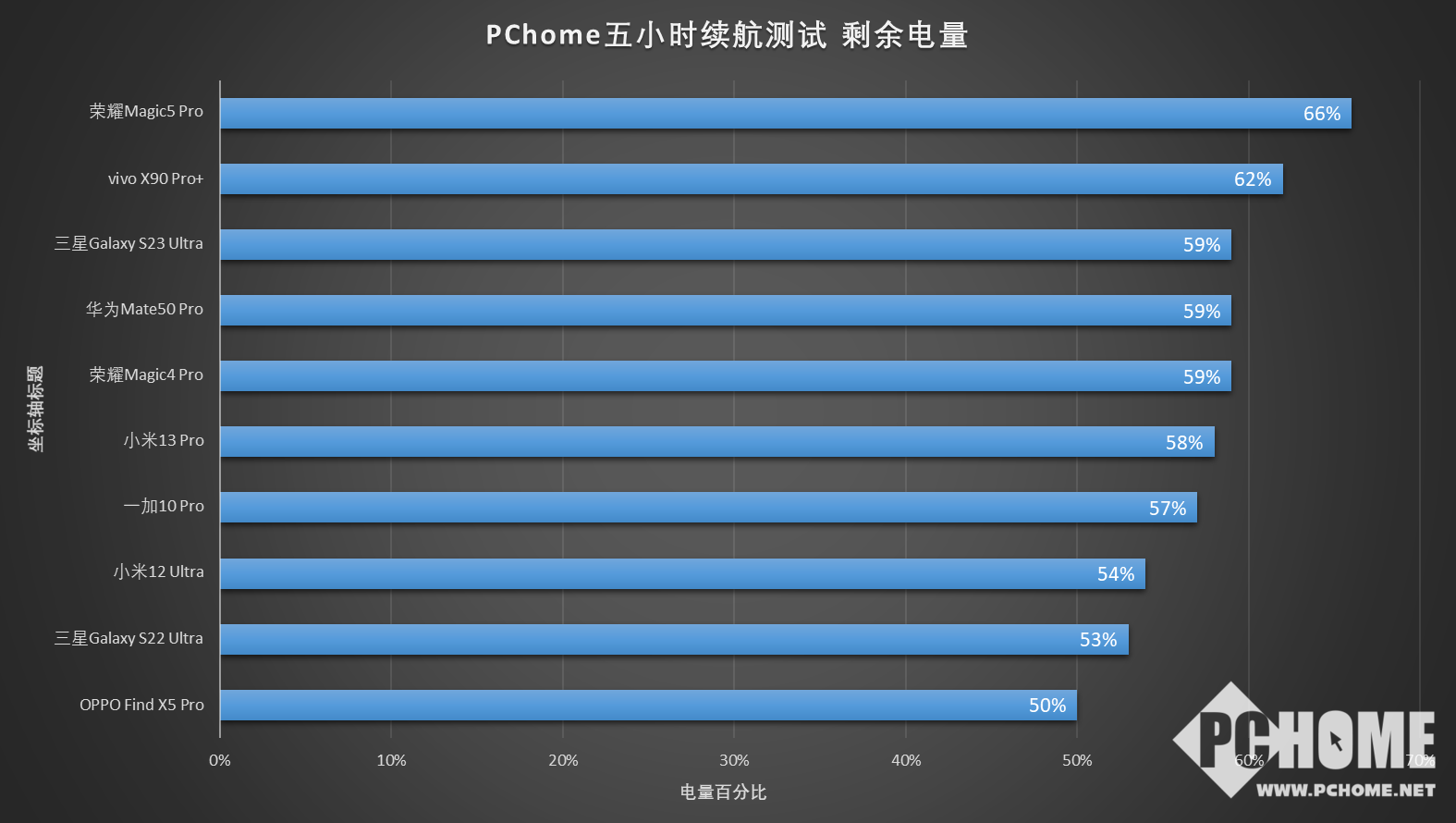 在实际的续航测试成绩上,荣耀Magic5 Pro在5小时的高强度测试后,剩余电量为66%,排在11款旗舰机中的第一位,比起第二名的手机多了4%的电量,比起排在第十一的手机,剩余电量多了16%,领先幅度十分巨大。荣耀Magic5 Pro更大的屏幕尺寸,显然没有拖累续航,更大的电池容量完全弥补了额外的电池消耗。