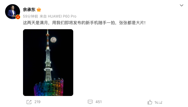 2023年3月9日,华为常务董事、终端BG CEO、智能汽车解决方案BU CEO余承东在社交媒体发文称,“这两天是满月,用我们即将发布的新手机随手一拍,张张都是大片!”仔细观察余承东微博的小尾巴为华为P60系列,这或许意味着,华为P60系列已经蓄势待发。