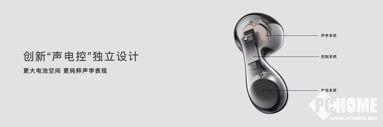 有的朋友可能会担心半入耳形态的耳机会阉割音质,针对这一点,华为FreeBuds 5采用了“声电控”三分离设计,发声单元模组独立置于耳包,电池模组独立置于耳柄,控制电路板独立置于起到衔接作用的耳杆,器件可以有足够的空间发力。