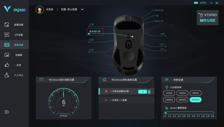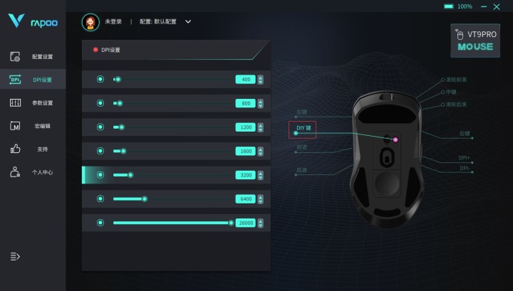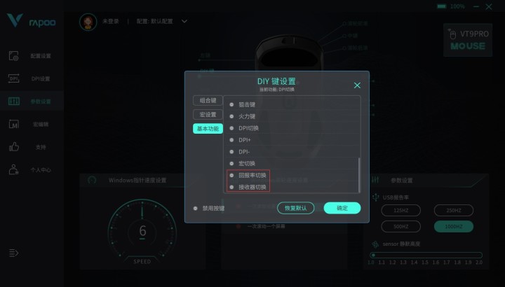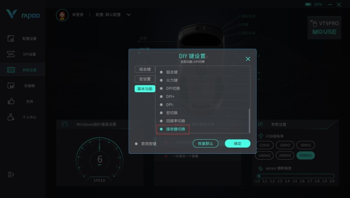 雷柏VT9PRO系列作为目前雷柏无线游戏鼠标的明星爆款之一,强大的性能以及轻量化设计为游戏鼠标市场增添了一枚重磅炸弹。其中1+9个自定义按键编程的加入也让鼠标拥有了更多可玩的操作性,如宏定义,多媒体等多种功能。而位于鼠标底部的特殊按键DIY独立键作为自定义按键可编程的一员,除了与其他普通9个按键丰富的多功能自定义功能之外,还加入了“回报率切换”以及“接收器切换”两个新的功能模块。下面给大家讲解DIY按键可扩展功能的使用方法(DIY独立键出厂默认DPI切换功能)。