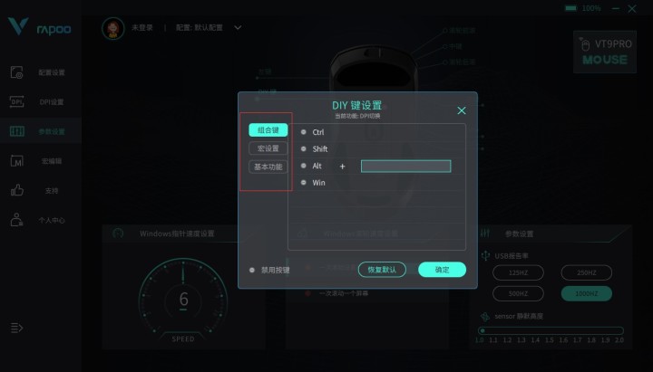 我们可以看到在“DPI设置”以及“参数设置”里都能自定义DIY按键的功能。