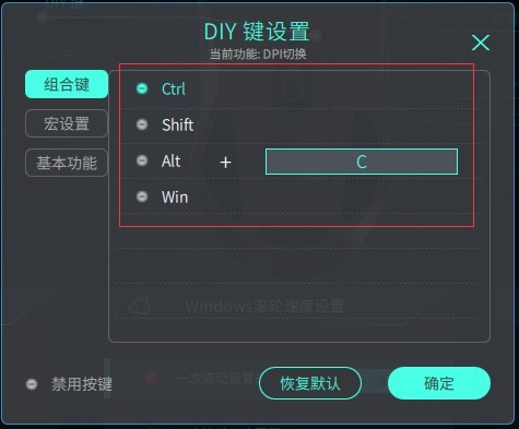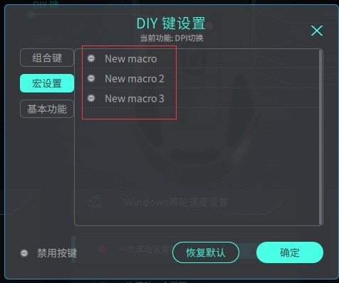 四:我们以”参数设置”页面为例,点击DIY键,可以看到有“组合键”、“宏设置”、以及“基本功能”三大模块组成。