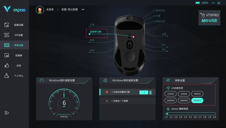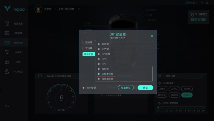 “回报率切换”:通过设置DIY按键为“回报率切换”功能,VT9PRO通过与另购的雷柏4K接收器配对之后,在USB回报率页面分别显示125Hz/250Hz/500Hz/1000Hz/2000Hz/4000Hz六档回报率数值(1K接收器模式下,可以切换125Hz/250Hz/500Hz/1000Hz 4档回报率),即可实现一键点击DIY按键切换六档回报率数值,在丝滑的精准操作与更长的续航之间来回随心转换。