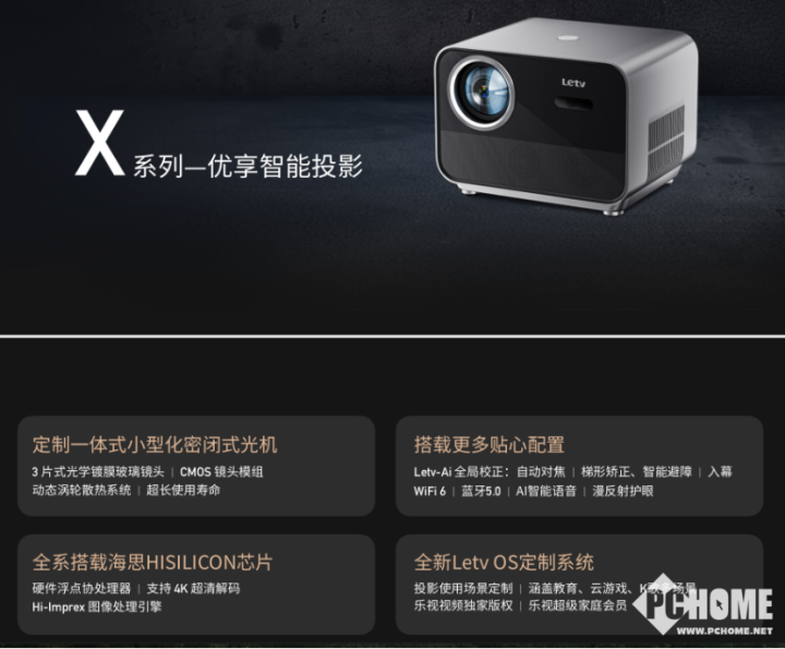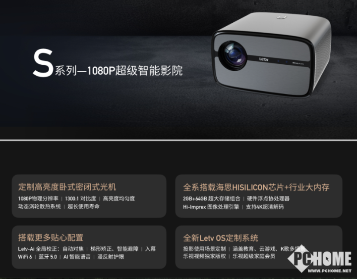 乐视S系统1080P超级智能影院采用定制高亮度卧式密闭式光机,全系搭载海思HISILICON芯片,支持4K超清解码及Hi-Imprex 图像处理、1080P物理分辨率、全新Letv定制交互系统满足教育、游戏、K歌、观影、户外等全场景需求。