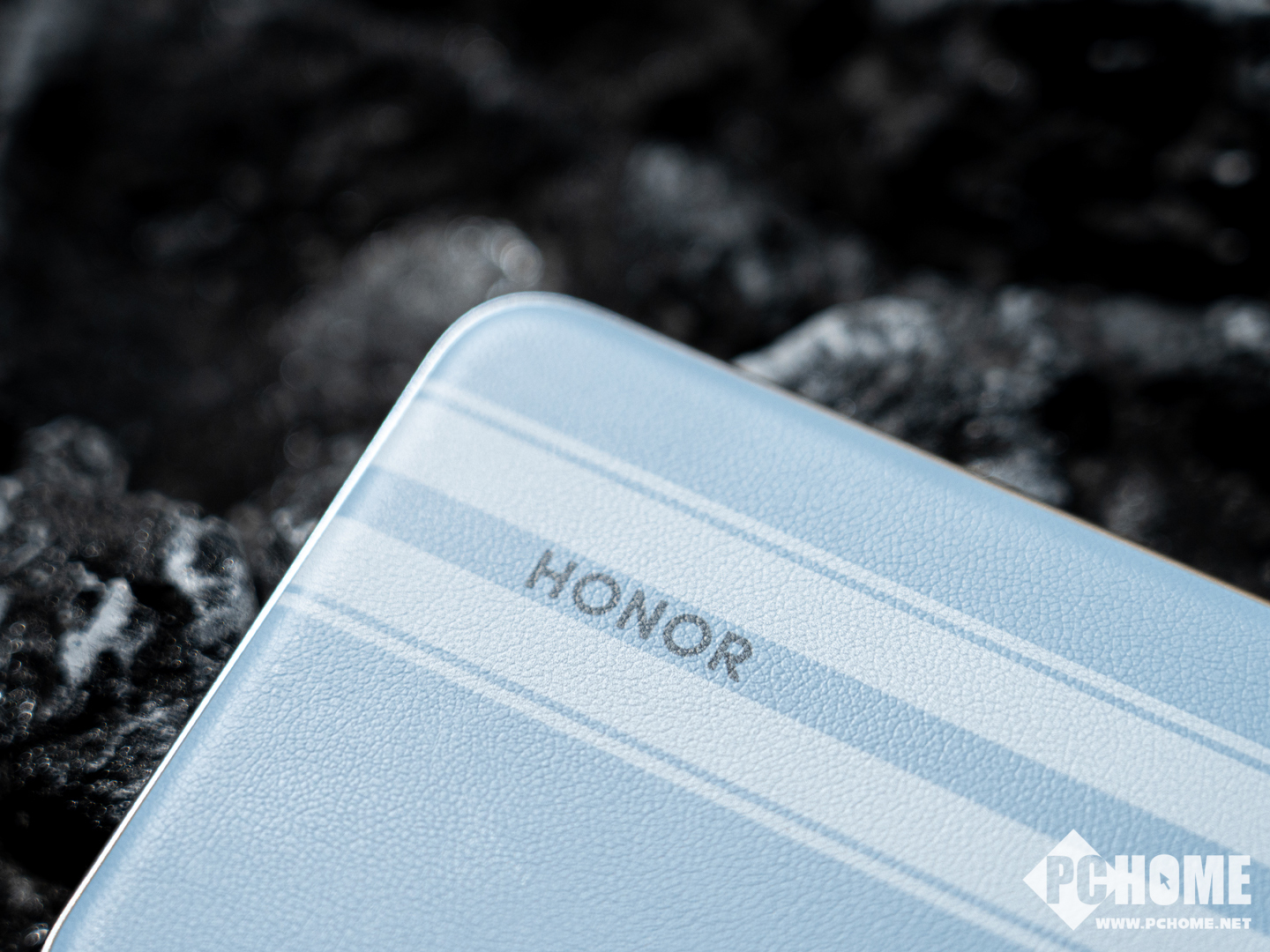 荣耀90 GT的「GT蓝」配色背部采用了极为细腻的皮质材料,天空蓝为基底的主配色下,两条象征赛车比赛旗帜的白色条纹贯穿手机,在清爽的同时带来了无限的速度感。