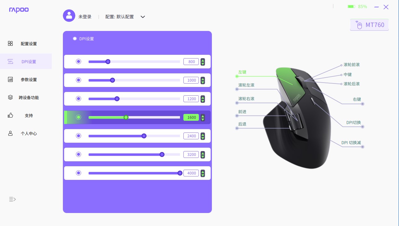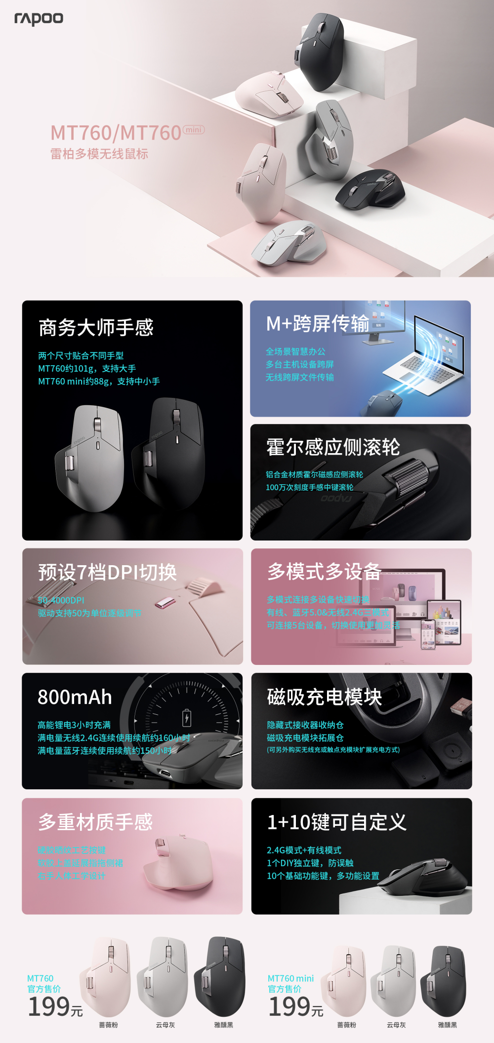 无线充电、多模切换、跨屏传输、霍尔感应侧滚轮、7档DPI、800mAh、160小时无线续航、10键可自定义。雷柏MT760多模无线鼠标开启无线跨屏的办公便利普及。