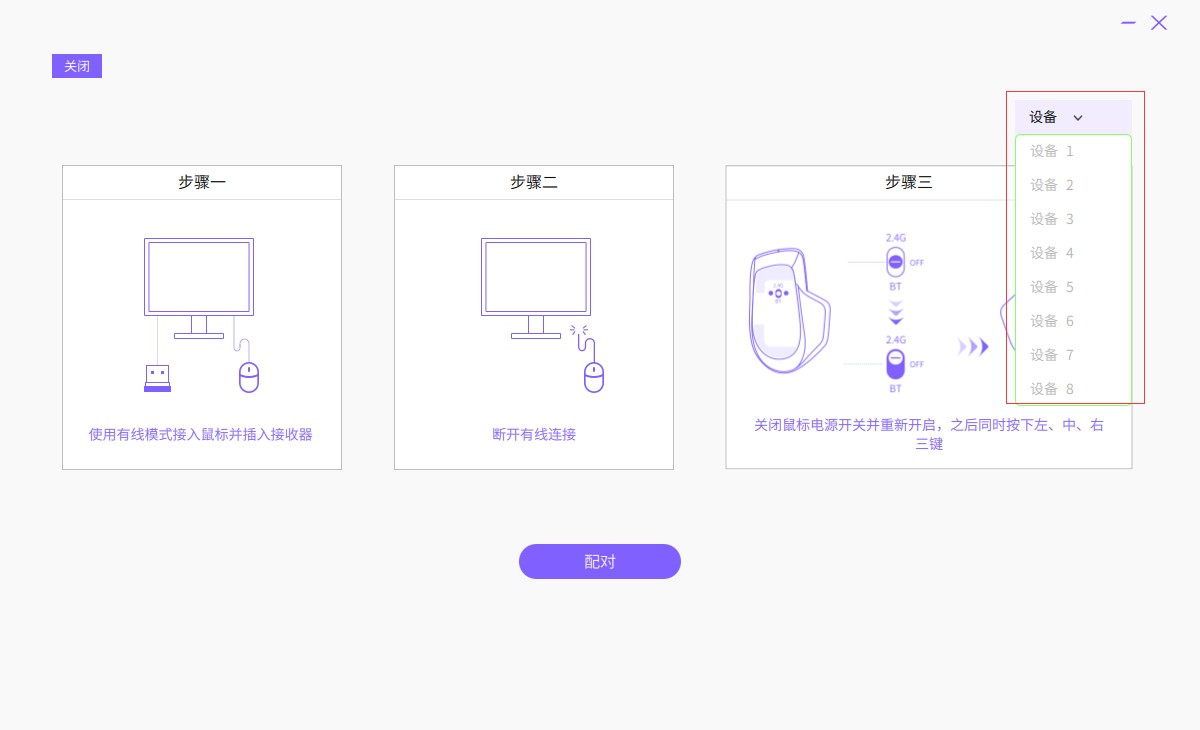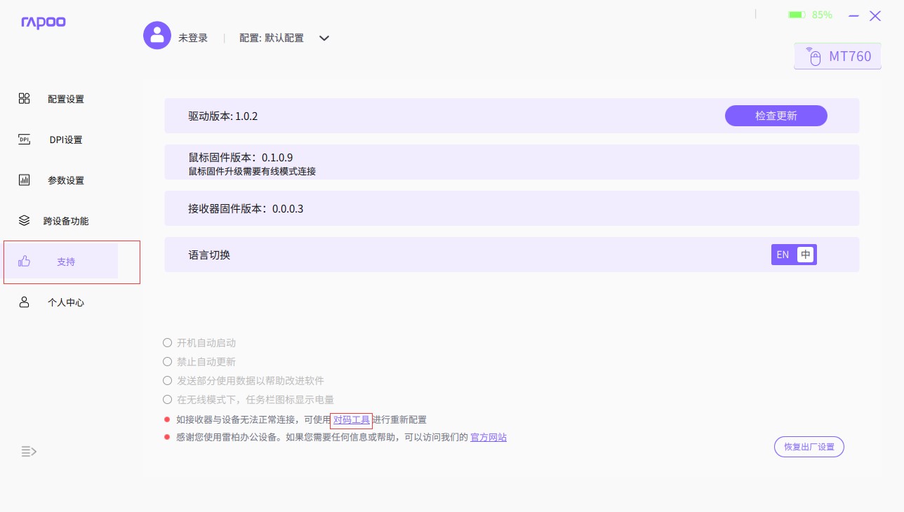 步骤二:点击“支持”页面,选择“对码工具”,在右上角给鼠标选择相应的ID设备编码,设备1、设备2、设备3......最多支持6台设备跨屏操作,再根据提示分别完成对码操作。