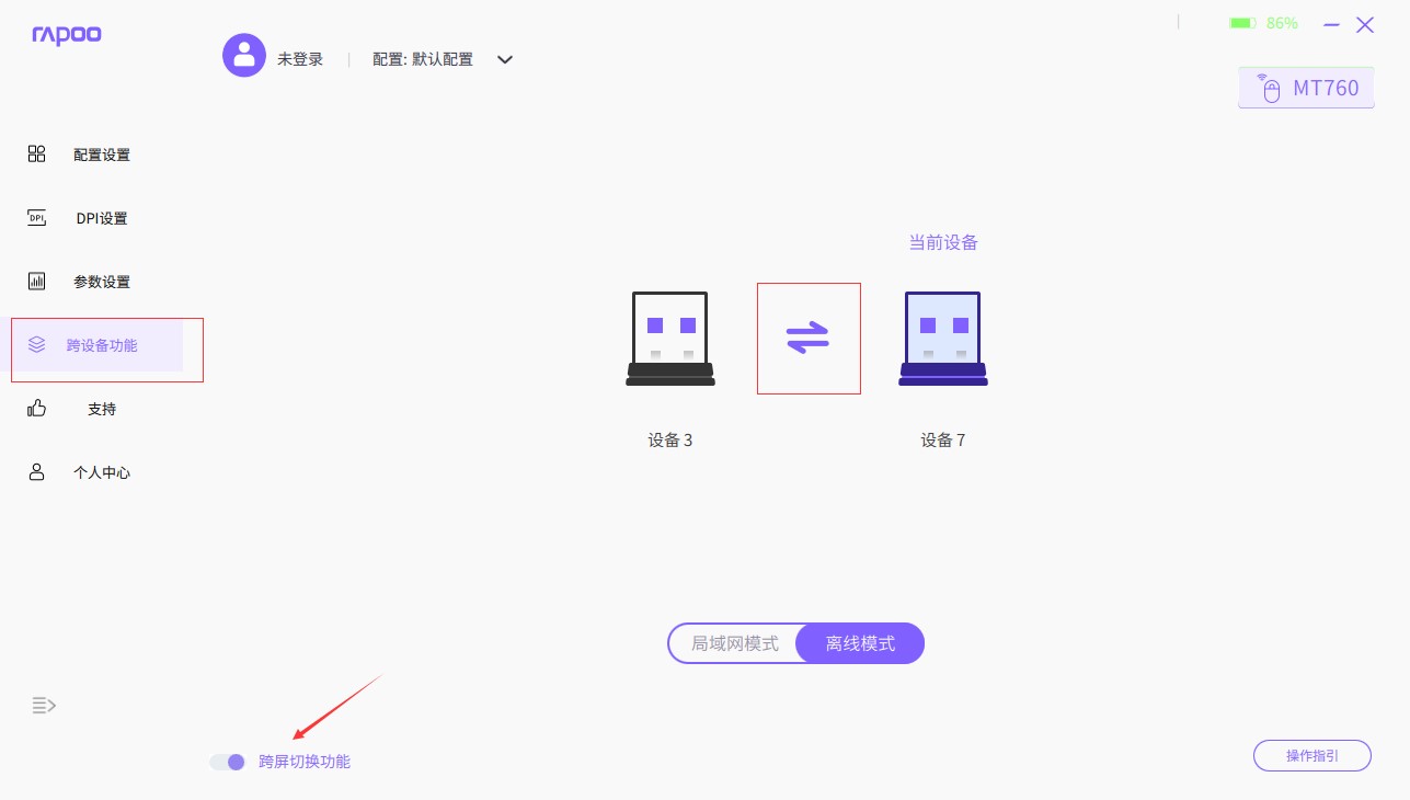通过设备中间的点击切换按钮,可根据电脑设备摆放的位置,可切换当前设备与其他设备的移动顺序。