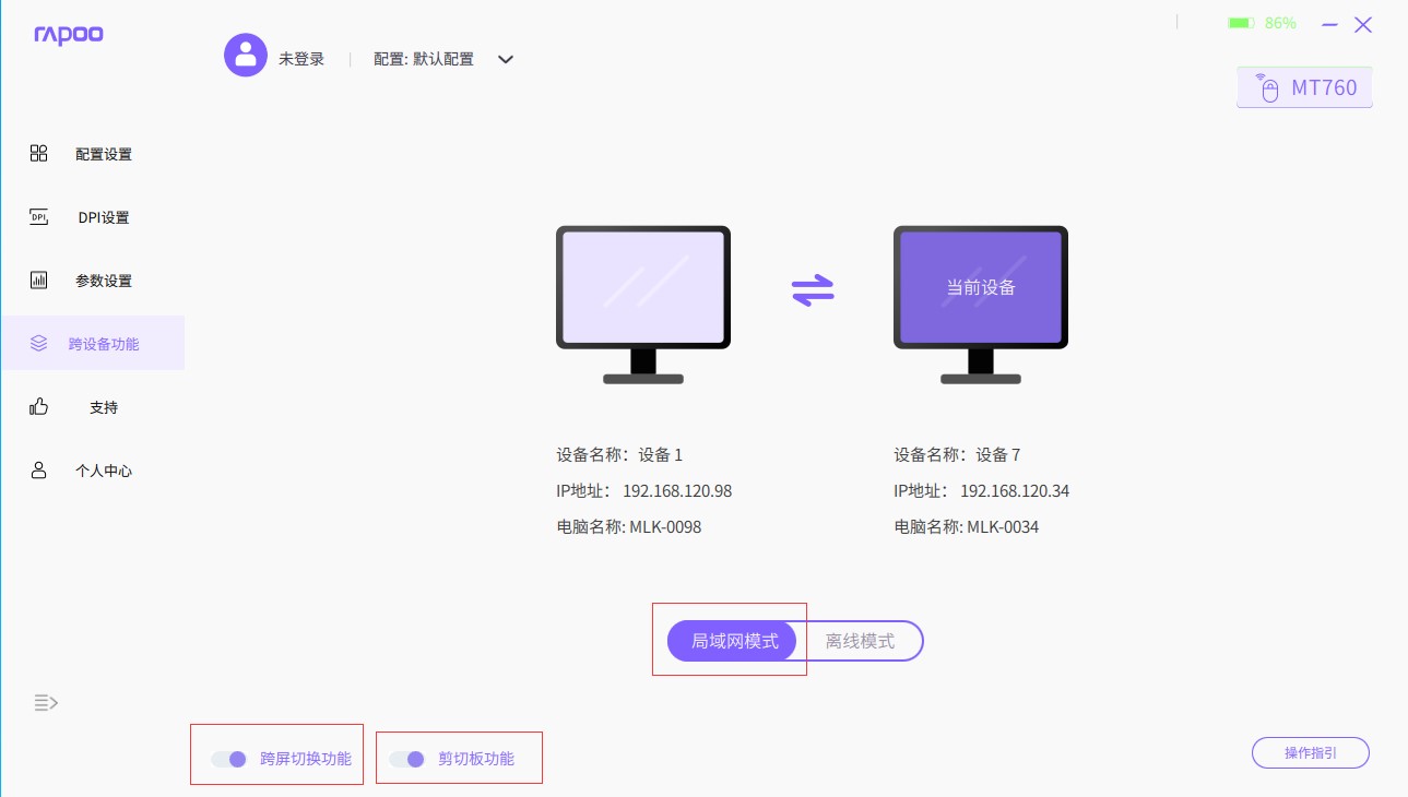 调整完毕后,所需要操作的文件传输共享的设备都需要打开界面中间的“局域网模式”,并且同时也需要打开左下角的“剪切板功能”以及“跨屏切换功能”,即可实现设备之间的内容通过复制黏贴,传输到其他设备中。