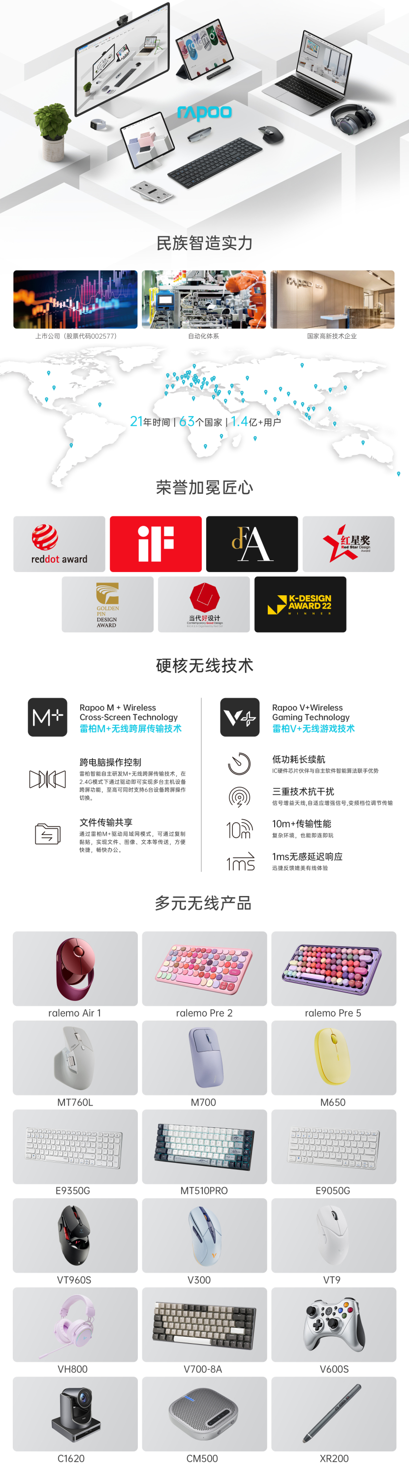 雷柏外设核心技术--“+计划”,发挥长期积累的技术优势,布局升级,优化迭代,推动无线技术的普及应用,驾驭科技服务于用户。加入星闪联盟、国产芯片操作系统(桌面类/服务器类)认证加持,将创新与技术相结合,“更稳更快更精准更便捷”,展现真正国产力量。雷柏业务已拓展至全球63个国家,累计服务超1.4亿+消费者,做好每一个细节,打造满足不同用户需求的产品,视觉、触感、听觉三感营造美好生活。