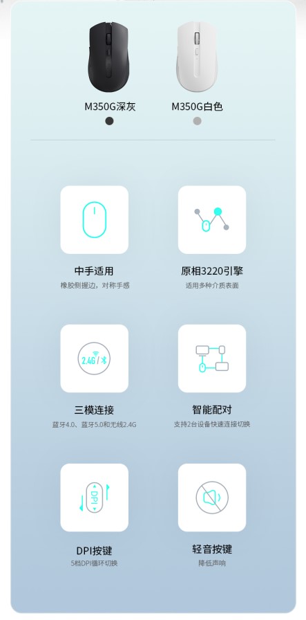 雷柏推出了雷柏M350G 2024版多模式无线鼠标,专为商务办公人群打造。2.4G/蓝牙,多设备切换,繁杂工作从容应对。中手手型,双材质手感,原相3220引擎,适用多种介质表面,5档DPI可循环切换,轻音按键让鼠标能更好的在办公场景下使用,为商务办公人群带来高性价比鼠标的又一选择。