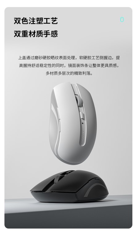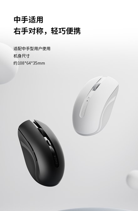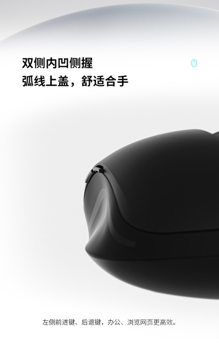 鼠标适合中手用户使用,双侧软硬胶内凹侧握,弧线的上盖,右手对称的设计,轻巧便捷。双色的注塑工艺,双重的材质手感,以及镜面的装饰条无论是从手感还是外观来说都是非常惊艳的,此外左侧拥有前进键、后退键,办公、浏览网页更高效。