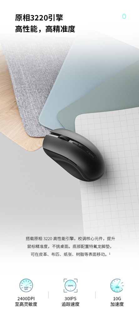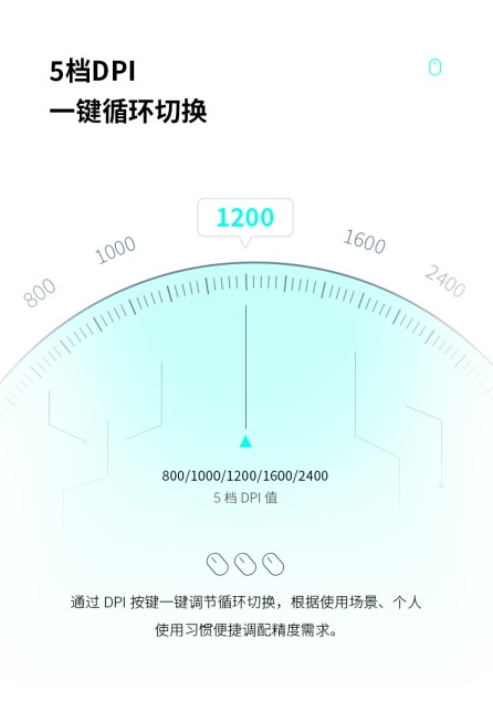 搭载原相3220的高性能引擎,反应灵敏,在皮革、布匹、纸张等表面使用,亦能准确定位,让你随时进入工作状态。预设800/1000/1200/1600/2400 5档DPI值,通过顶部的鼠标DPI按键可一键在5个档位中循环切换。