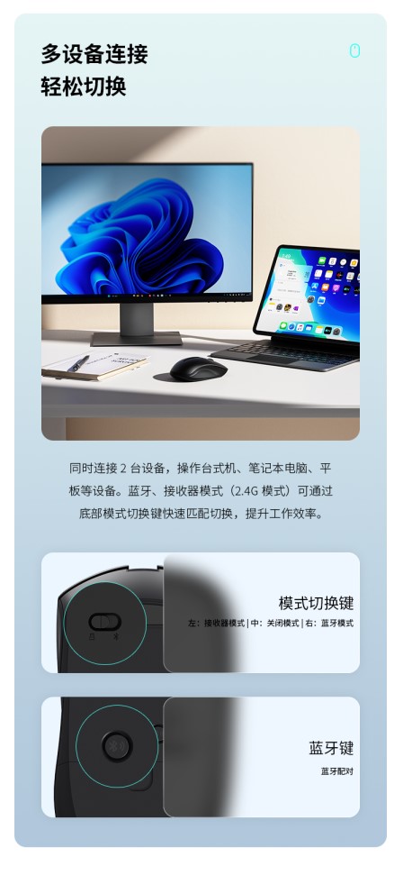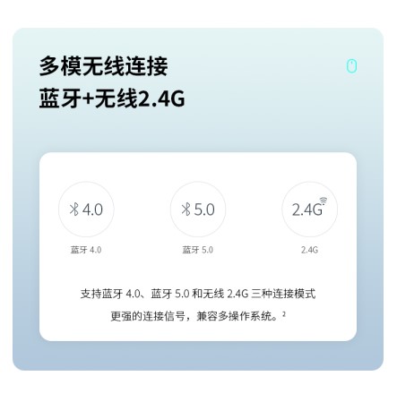 鼠标提供蓝牙5.0/4.0和无线2.4G三种智能连接模式,传输稳定可靠,即便是接收器丢失或USB口不足也不影响使用。最多可连接2台设备,通过自带的模式切换键开关拨动可在各个设备间快速切换,让你从容应对繁杂工作,化身职场达人。