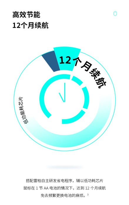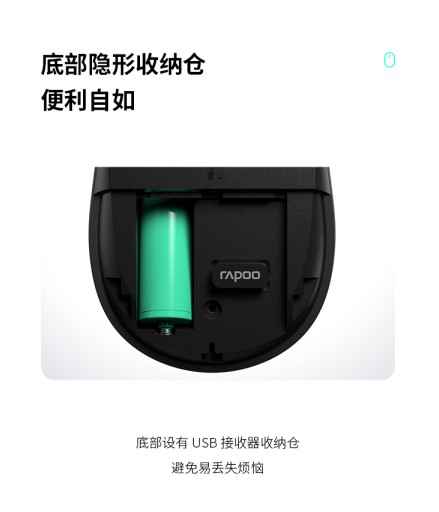 搭载雷柏自主的研发省电程序,辅以低功耗芯片,鼠标在1节AA电池的情况下,达到12个月续航,免去频繁更换电池的麻烦。底部设有USB接收器收纳仓,避免易丢失烦恼。