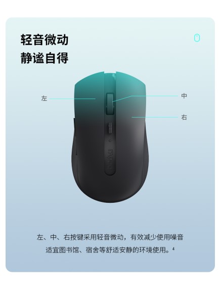 鼠标轻音微动的加入有效减少使用噪音,打造一个宁静的办公环境,适宜图书馆等环境使用。