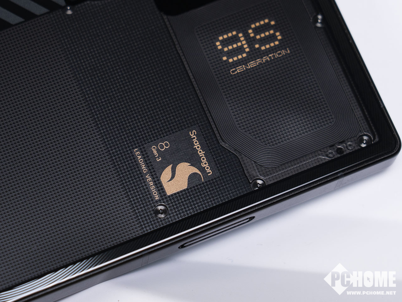镜头区域采用的是垂直排列,摄像头下方是高速离心风扇,转速提升至22000转/分,并且拥有全新瀑布风道,散热速度更快。机身右侧部署了大量的按键,两侧提供了标志性的触控式肩键,运用防滑的玻璃材质,操控起来十分随意。圆形的电源键位置适中,与长条的音量控制区别显著,盲操辨识性高不会误操控。红色的拨杆则可以一键进入到游戏大厅中。