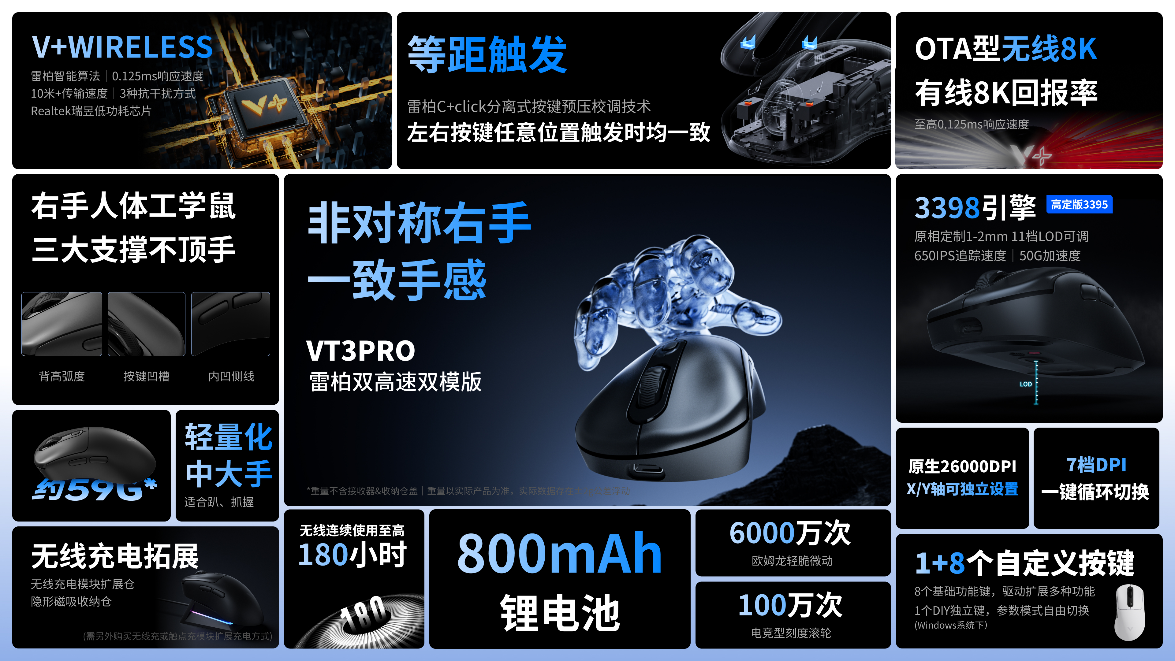 VT3PRO使用了原相3398光学引擎(3395高定版),可调的DPI范围值为50-26000DPI,支持以50DPI为一个单位进行选择。