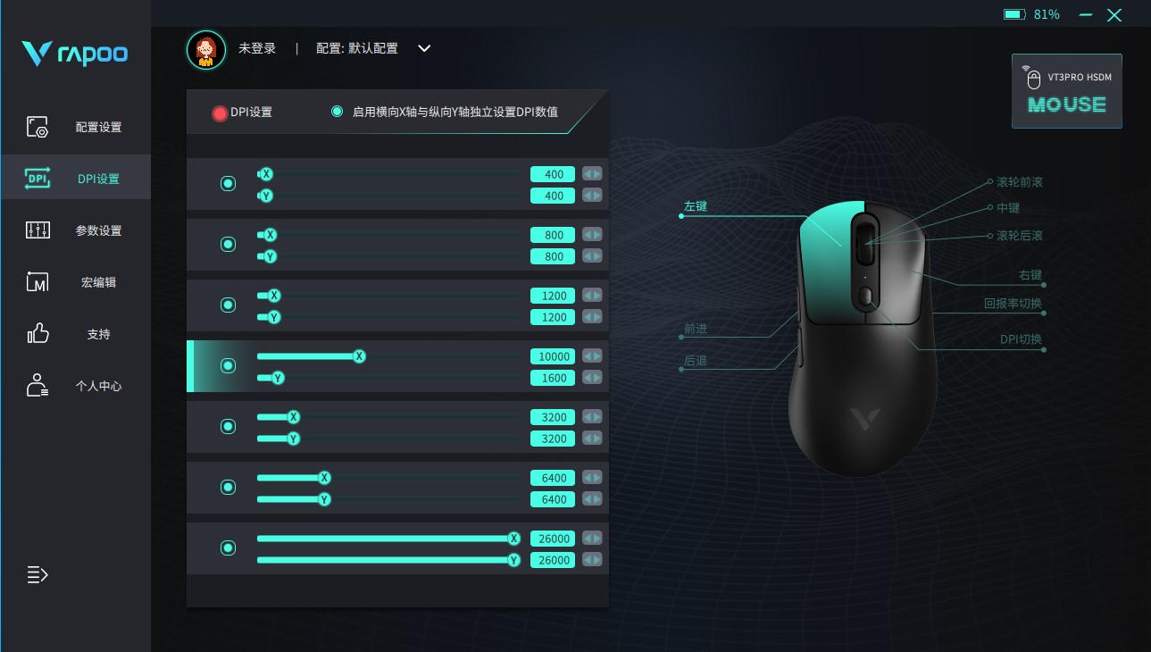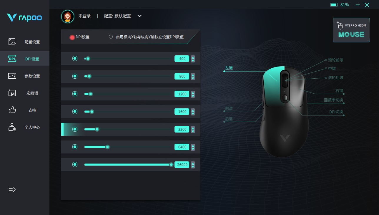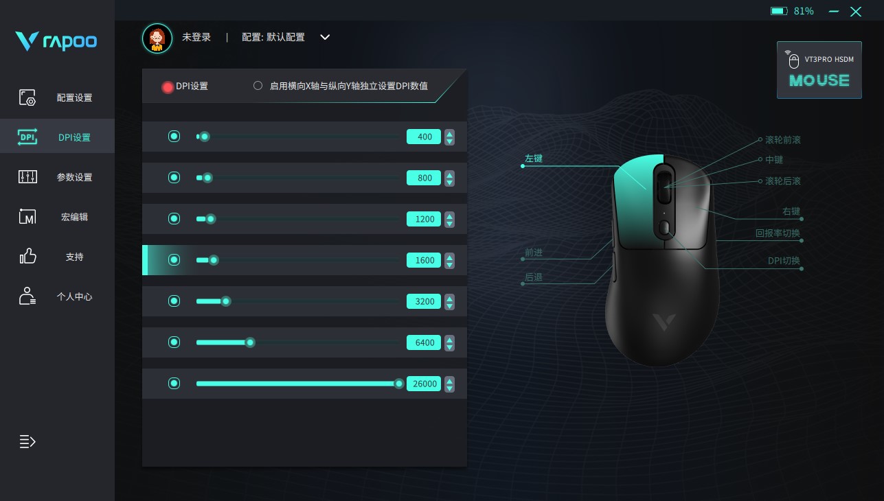 打开已经安装好的雷柏VT3PRO双高速双模版鼠标驱动程序,在左侧菜单我们可以看到“配置设置“、”DPI设置“、”参数设置“、“宏编辑”、“支持”、以及云端存储自定义设置可上传的“个人中心”六个选项。需要说明的是,进行任何设置的调整与改变,大部分功能直接使用相关的动作,就能生效。