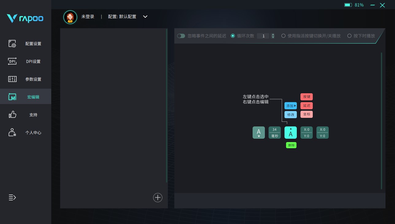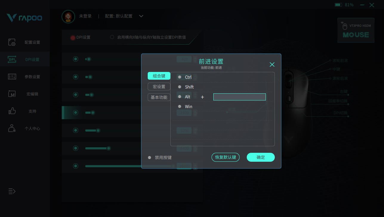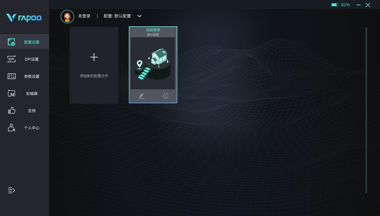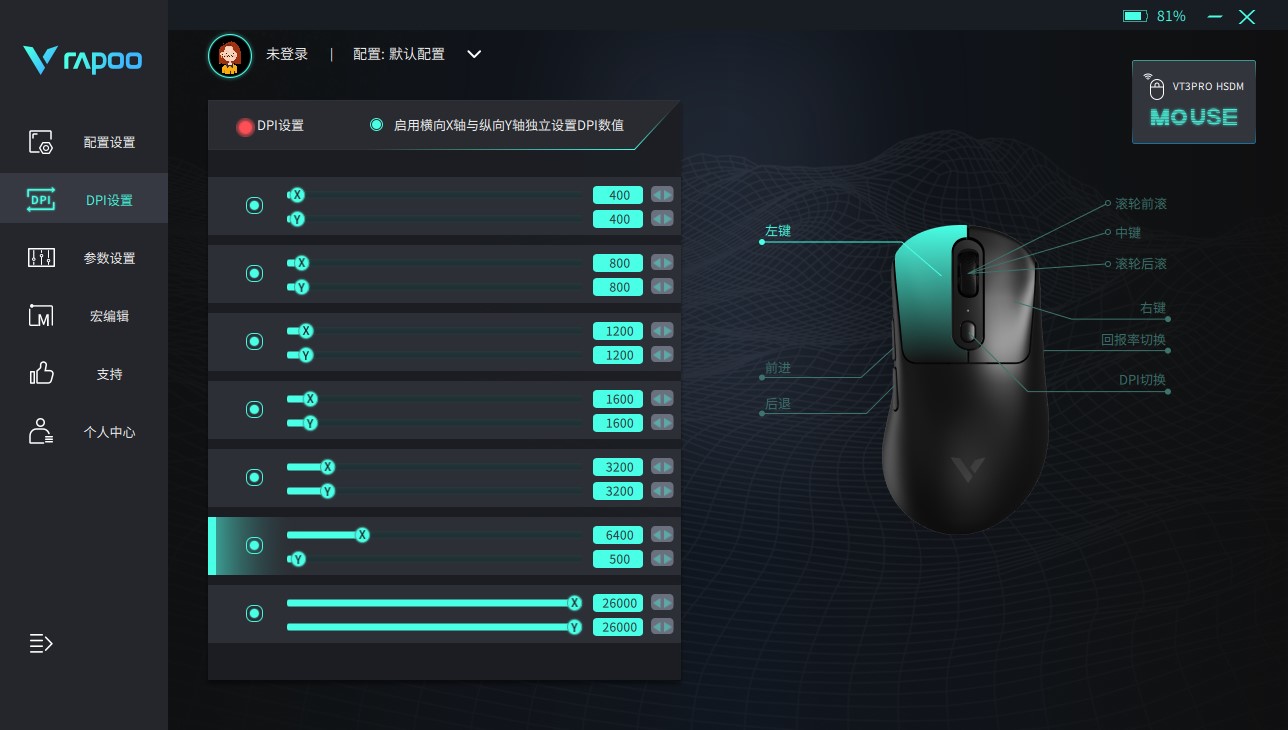 打开已经安装好的雷柏VT3PRO双高速双模版鼠标驱动程序,在左侧菜单我们可以看到“配置设置“、”DPI设置“、”参数设置“、“宏编辑”、“支持”、以及云端存储自定义设置可上传的“个人中心”六个选项。需要说明的是,进行任何设置的调整与改变,大部分功能直接使用相关的动作,就能生效。