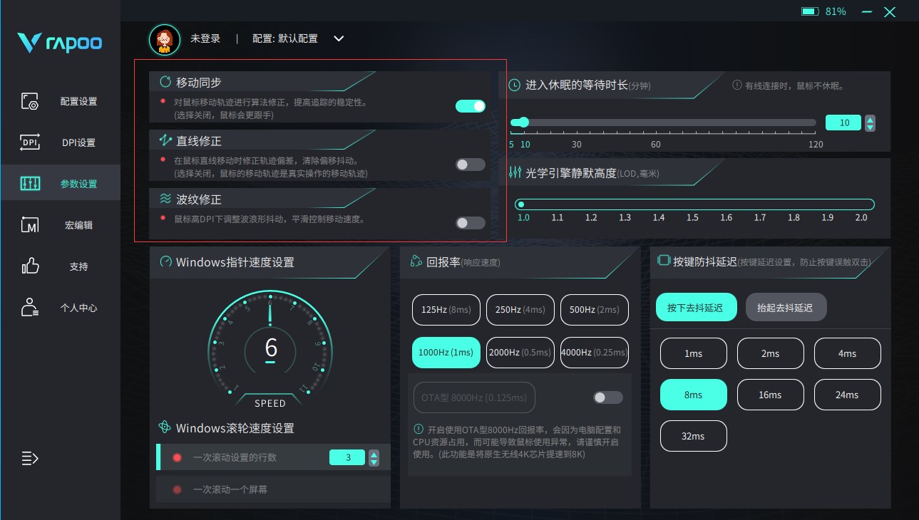 此处有多个鼠标功能模块设置供玩家来使用操作,如辅助功能的“移动同步”,“直线修正”,“波纹修正”;“进入休眠的等待时长”的时间调整,“光学引擎静默高度LOD”的调整功能,“Windows指针速度设置”,“回报率”的设置,“按键防抖延”的设置等多个功能,接下来详细的说下各个功能的作用。