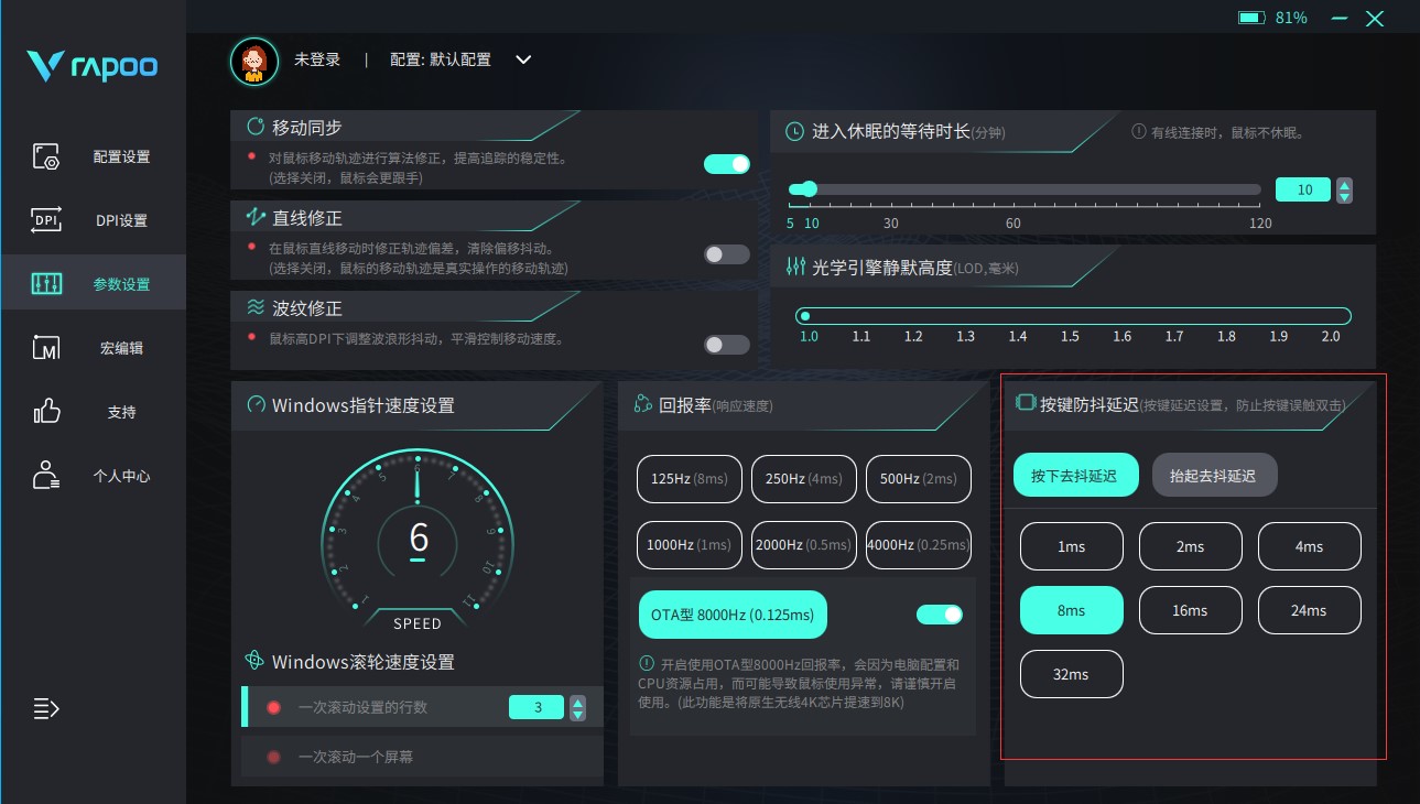 在“按键防抖延迟”的模块中,用户可以设置按下微动以及抬起微动的响应速度,一共是1ms/2ms/4ms/8ms/16ms/24ms/32ms七档响应时间给予用户选择,按下去抖的延迟时间越快,响应的速度则越快。并且可以修正鼠标默认按下去抖的延迟时间,防止按键误触双击。抬起去抖延迟则的数值高低关乎到你下一次按下鼠标的时间响应间隔,设置的时间越短,断开功能的时间则越快,则下一次按下鼠标的间隔触发时间也越快;设置的时间越长,断开功能的时间则越慢,下一次按下鼠标的间隔触发时间也越慢。此项“按键防抖延迟”还是按需设置,找到最合适自己的时间点。