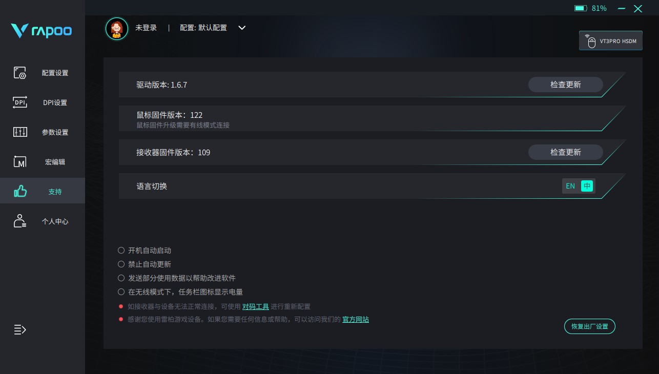 在“支持”设置页面中,可以对VT3PRO的驱动版本和固件版本进行检查更新,也可以禁止自动更新,发送部分使用数据以帮助改进软件,还可以通过驱动界面直接访问雷柏官方网站以及恢复出厂设置,重置驱动设置。并且在语言切换栏中,有中英切换选项,方便海外的用户使用。并且还贴心的加入了“在无线模式下,任务栏图标显示电量”,这个功能可以在你最小化驱动的时候,任务栏上显示鼠标当前剩余的电量。并且还有对码工具可以对鼠标与接收器进行重新配对使用,非常方便。