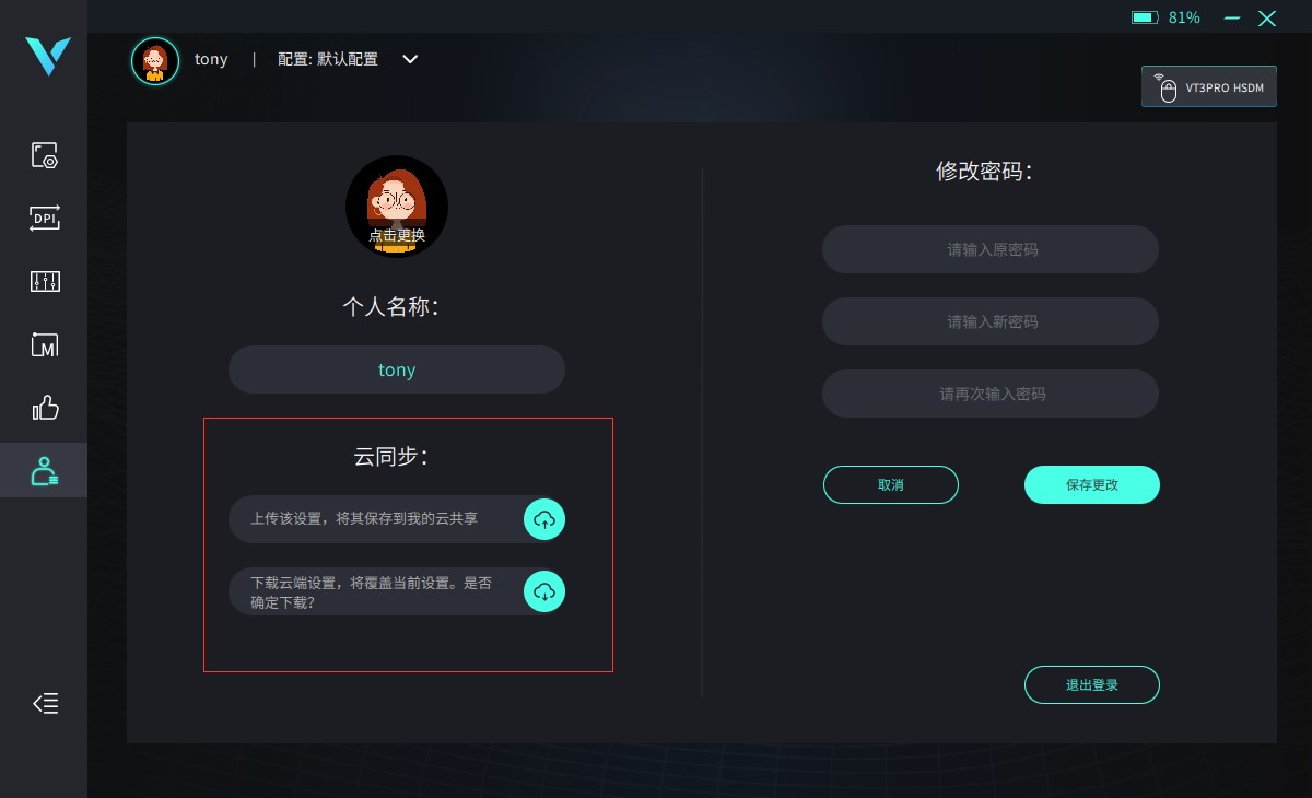 前面有提到过的板载存储与云存储自定义设置通过登录V系列智能云储存可将配置文件上传至共享,分享给其他玩家,在个人中心可以实现。用户只要登录个人中心,您通过驱动在鼠标中所设置的所有内容都可以通过云存储实现共享保存。您可以在别的设备中通过个人中心的登录,将您的鼠标配置一键下载分享给其他用户,实现配置的共享,一起组团攻占胜利营地。