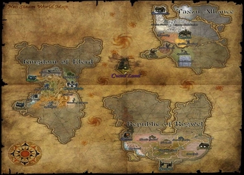 《蒸汽幻想》的游戏世界由三块相邻的大陆组成,分别代表着三个国家。游戏所设计的世界之大绝不逊于“魔兽世界”和“天堂2”。三块大陆各自拥有多变的地形环境以及建筑物风格。机械装置、城堡码头、遗迹地牢、魔法森林等等各种丰富的游戏场景将一一呈现在玩家面前。目前所开放的地图区域已达60%以上。