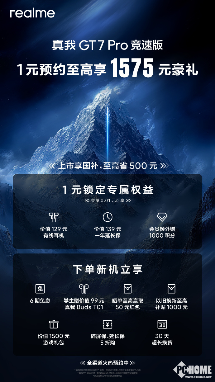 真我GT7 Pro竞速版现已开启抢先预约,1元预约至高享1575元豪礼,包含有线耳机、一年延长保、1000会员积分及诸多权益,会员更有专享权益,0.01元即可享受一年延长保和1000会员积分。不仅如此,真我GT7 Pro竞速版上市即享国补,至高省500元。