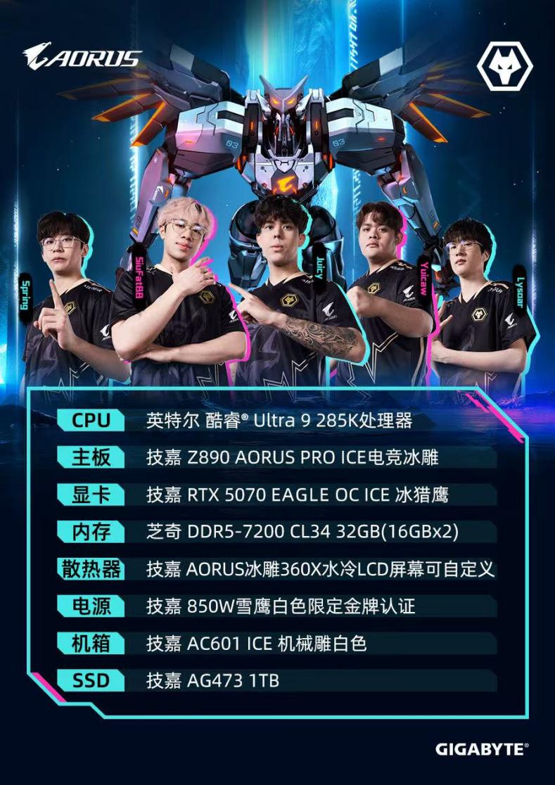 为竞技而生,为胜利而战! 在本次大师赛中,狼队的每一场胜利背后,都离不开他们日常刻苦的训练,在战队日常训练上均采用高阶配置:搭载英特尔Ultra 9 285K处理器、技嘉Z890 AORUS PRO ICE电竞冰雕主板与RTX 5070显卡的强悍组合,以澎湃算力瞬间撕裂战场僵局!