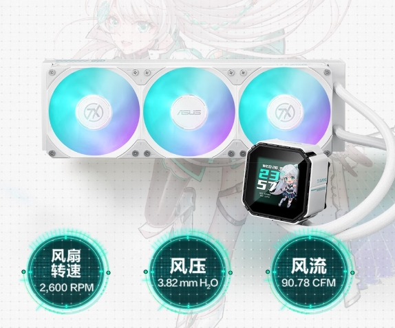 对于追求高颜值桌搭的玩家而言,华硕天选TX GAMING 360 LCD水冷散热器无疑是不二之选。其采用了定制的天选外观,整体设计简约时尚且个性鲜明,萌趣元素巧妙融入其中,精准击中了二次元玩家的喜好,让人一眼便为之倾心。另外,还配备了一块2.8英寸的LCD屏幕,拥有高清画质,能够实时、精准地显示电脑的各项参数,让玩家随时掌握电脑的运行状态。而且,还支持DIY动图画面,玩家可以根据自己的喜好和创意,自由定制屏幕上的显示内容,为桌面增添一份独一无二的个性色彩,真正实现了DIY的自由与乐趣。