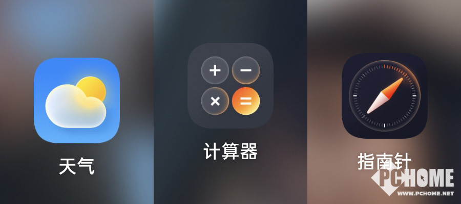 首先我们来看新系统的界面变化,各种图标更注重光的呈现,通过光边、光晕、阴影效果,使之符合真实情况的美感。这点在所有系统图标中都有呈现,天气图标就呈现除了太阳照射云朵应有的阴影,计算器、指南针有着斜向光照射的光晕。