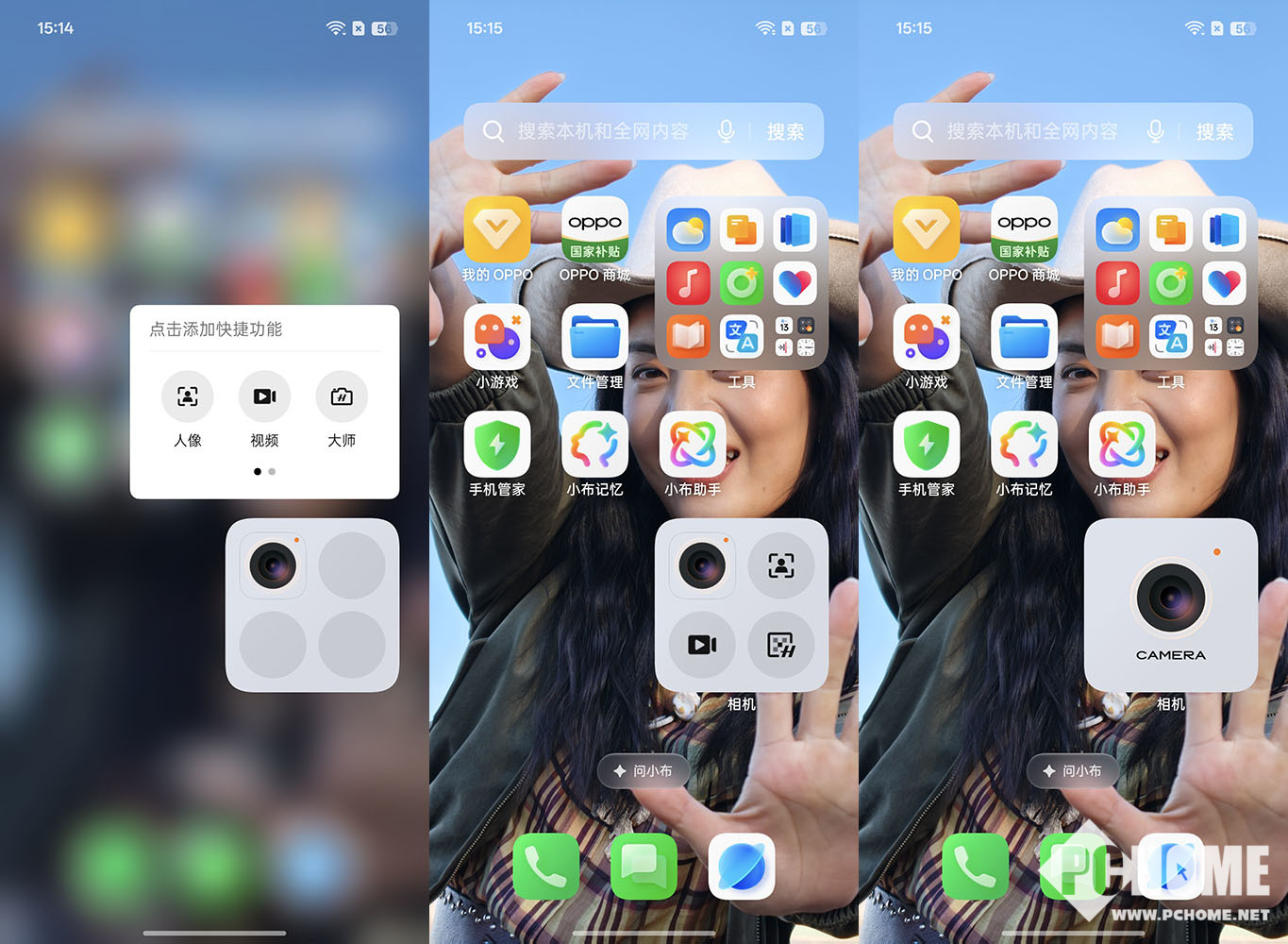 主界面布局并未有变化,若你想玩出些个性化元素的话,那还真得是ColorOS 16不可。在之前的系统中,可以随意拖拽文件夹的大小,现在很多系统图标也支持了拖拽放大,常用的图标可以放大到长条形或是2x2大小,方便频繁点击使用。同时,图标并不是单纯的放大,而是在放大的同时添加快捷功能,比如便签功能,就能设置快速新建以及新建语音便签两个快捷功能;相机图标放大后,能承载的快捷功能就更多了,人像、XPAN等模式即可实现桌面一点直达。