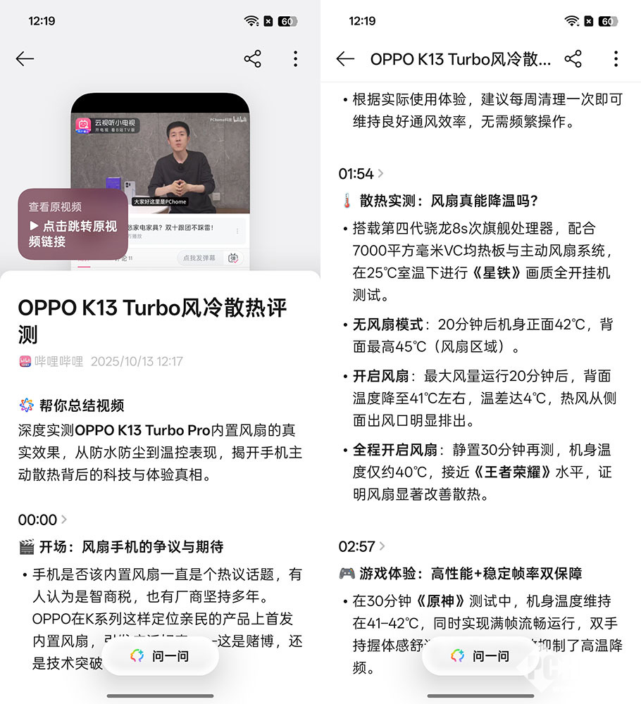小布记忆功能也得到了进化,可以一次记录多图攻略或长截屏,一键记录取餐码过后,还能直接在流体云中弹出提示,不用再翻小程序查看。要说最好用的,还得是视频记录了。在任意视频中按下快捷键,小布会首先记下当前页面,并对视频的图像、音频、字幕内容进行提取,而后生成结构清晰的AI摘要,重点是带着时间点信息的,想要具体看什么,直接点时间即可自动跳转,连进度条都不用拖。这点对我们的帮助非常大,想要寻找发布会的重点内容,不用看完,小布就能搞定一切。